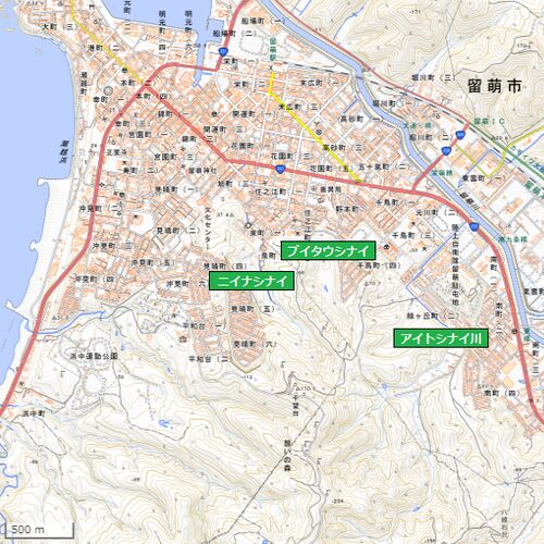 やあ皆さん、アイヌ語の森へ、ようこそ。 (この背景地図等データは、国土地理院の地理院地図から配信されたものである) 地図をクリックしたら地理院地図に飛べたりします。 ニイナシナイ nina-us-nay薪を切る・いつもする・川 (典拠あり、類型あり) 留萌…