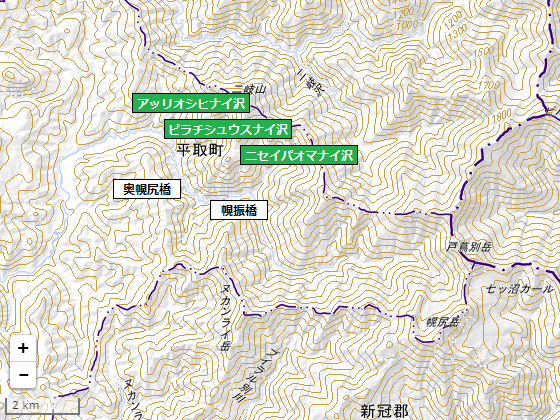額平川沿いの林道(幌尻岳の登山道としても使用されますね)は、ピラチシュウスナイ沢との合流点から 1 km ほど奥に進んだところにある「奥幌尻橋」から先は幅員の狭い道路として描かれています。更に 1.8 km ほど奥に進んだところには「幌振橋」という橋があるのですが、どことなく「ポロフーレベツ」っぽいですよね。