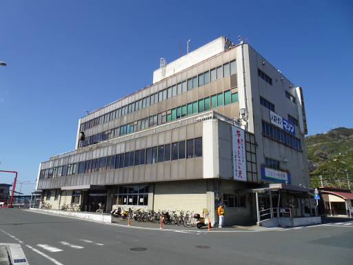 乗下船の車の姿が見えないことを確認してから(これ、重要です)、川の傍まで歩いて、八幡浜港フェリーターミナルを眺めます。3F がレストラン「マリン」です。