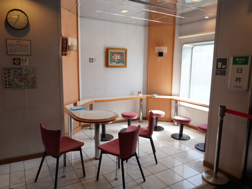 ちなみに、エントランスエリアの左右前方にはこのような「軽食コーナー」が用意されていて、売店で購入したソフトクリームや軽食を持ち込んで食べることができます。