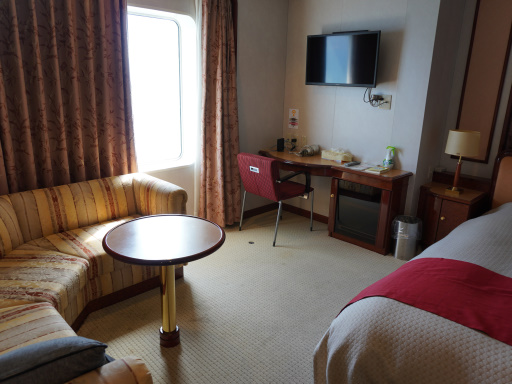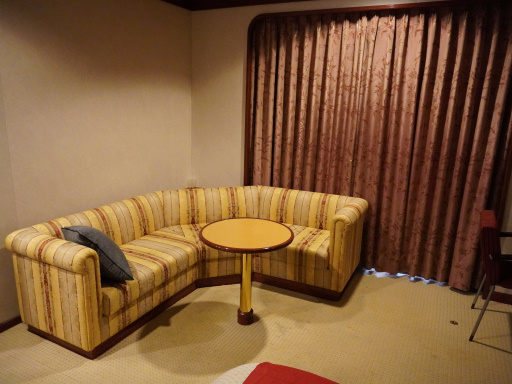 左舷の窓側、シャワールームの隣にはソファーセット(テーブルつき)も置かれています。
