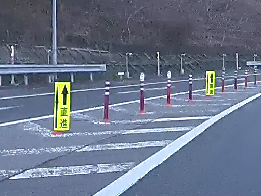 大分道から東九州道(北行き)に向かう車線が下り坂を駆け下りて、ようやく合流です。大分道からの車線が走行車線に化けて、別府からやってきた東九州道の車線が追い越し車線に化けるだけの、実は車線変更の必要がないとてもお気楽な構造です。よく見ると合流部のポールにも「直進」の警告が……。