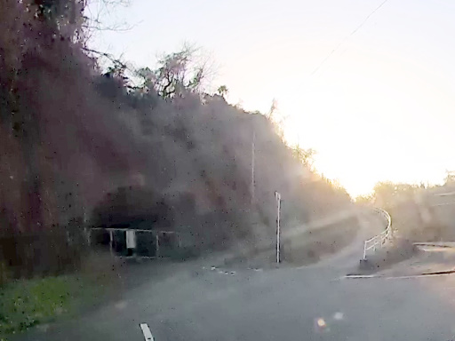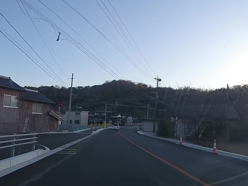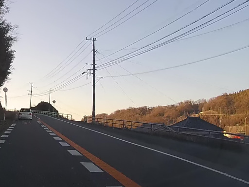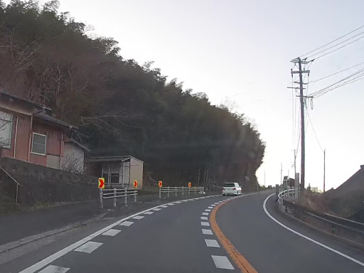 トンネルを抜けてから坂道を下って、集落に入りました。時間は 17 時 15 分を少し回ったあたりですが、夕日が尾根の向こう側に行ってしまったので、暗くなり始めています。