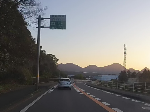 国東に入る車に対して検問を実施しているような石像(仁王像ですかね)の前を通り過ぎ、走ること数百メートルでカントリーサインが見えてきました。17:40 頃ですが、さすがに随分と暗くなってきましたね。