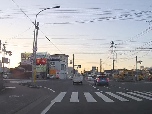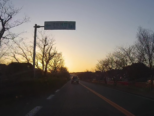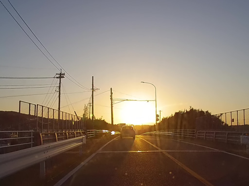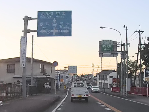 国道 213 号は、宇佐駅の北側で JR 日豊本線をオーバークロスします。見事に夕陽が真正面に来ましたね……。
