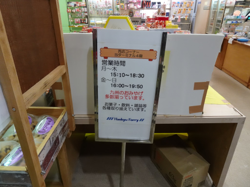売店コーナーの営業時間はフェリーの出港時間(正確には「乗船開始時間」)に合わせているようですね。乗船開始時間の 4 時間前から営業している(週末の場合)というのはかなり良心的に思えます。