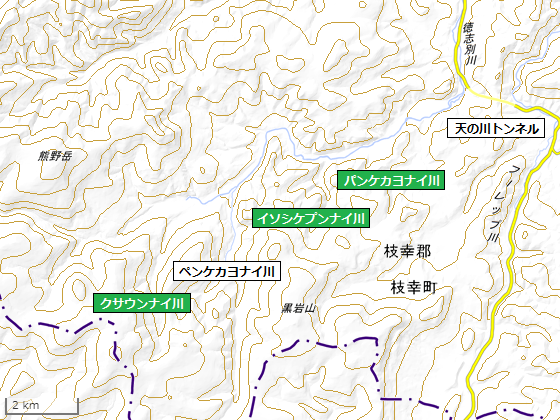 徳志別川の南支流(東支流)で、「パンケカヨナイ川」の西側(上流側)を流れています。この川も「東西蝦夷山川地理取調図」などには記載がありませんが、明治時代の地形図には「イソシケプンナイ」と描かれていました。