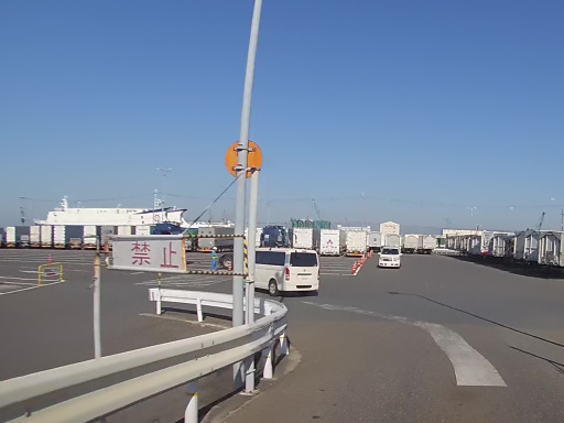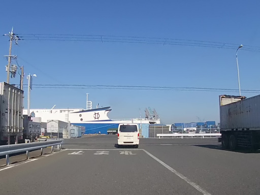フェリーターミナルの敷地(航送車待機場)の脇を通り抜けて、今度は右折です。