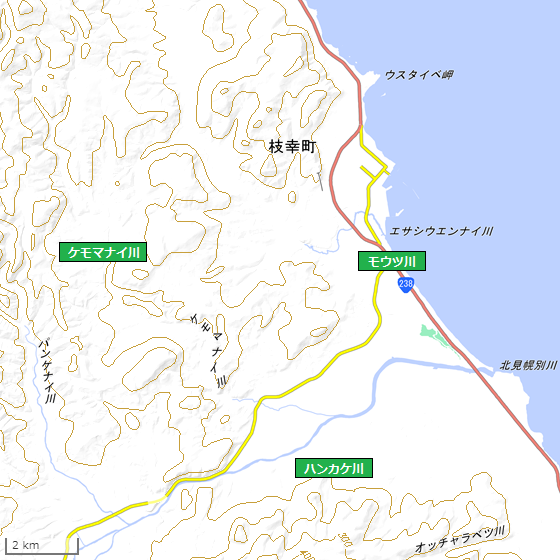枝幸町の市街地の南、道道 12 号「枝幸音威子府線」と道道 1069 号「ウエンナイ幌内保線」の間を流れる川の名前です。「東西蝦夷山川地理取調図」には「モウツ」と描かれているほか、「再航蝦夷日誌」にも「モウツ」とあり、「竹四郎廻浦日記」には「モウチ 砂浜」と記録されています。