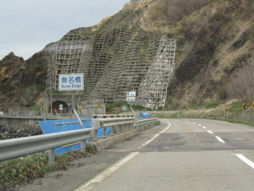 増毛町岩老を通過し、引き続き北へと向かいます。「無名橋」なる橋が見えてきましたが、これって素直に「名無しの橋」という理解で良いのでしょうか……?