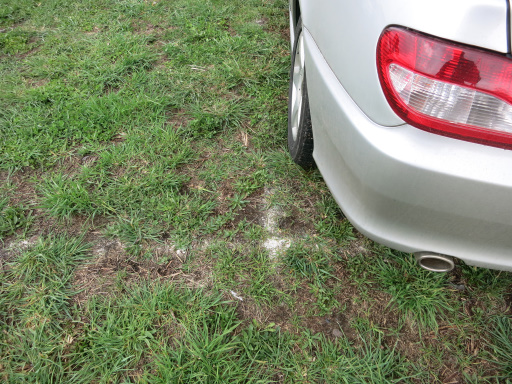 実はちゃんと石灰でラインも引いてあったんですよね。その割には左側のラインを踏みそうになっていますし、リアは枠からはみ出てしまってますし。駐車時には枠線を認識していなかった可能性もありそうな……(汗)。