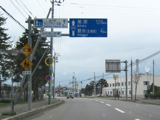 青看板の距離案内で「北竜」ではなく「碧水(北竜町)」とされる理由が、おそらくこちらです。ここ碧水で国道 233 号と国道 275 号が交叉しているので、青看板は碧水までの距離を案内することが理にかなっています。ただ、北竜町の役場があるのは碧水ではなく南隣の「和」なので、「北竜」と表記するわけにもいけない……ということではないかと……。