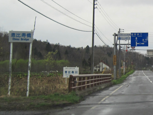 「恵比寿川」が見えてきました。コテコテの瑞祥地名に見えますが、元はと言えばこのあたりの「幌新太刀別川」がかつて「エピショマㇷ゚」と呼ばれていたことに由来する川名……と思われます。その「恵比寿川」を「恵比寿橋」で渡ると……