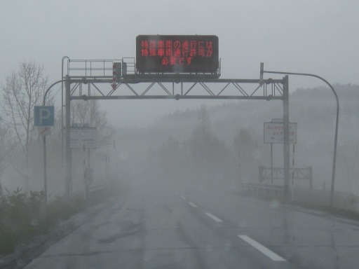 霧立峠を通行止めにする際に使用するであろうゲートが見えてきました。上に道路情報表示板も見えますが、「特殊車両の通行には特殊車両通行許可が必要です」と出ていますね。どこかの大臣を思い出してしまいましたが、きっと「これは意外と知られていない」ということなんでしょうか……。